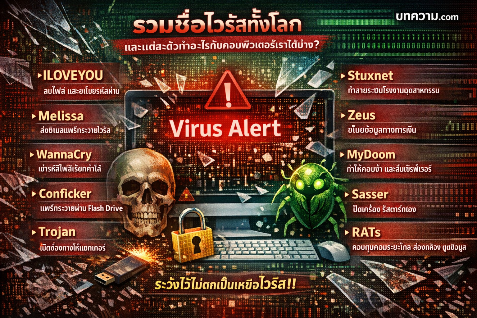 ความปลอดภัย ไวรัสคอมพิวเตอร์ ไอที รวมชื่อไวรัสทั้งโลก และแต่ละตัวทำอะไรกับคอมพิวเตอร์ เราได้บ้าง? admin ม.ค. 6, 2026 0 การรวมชื่อไวรัส R… Read More